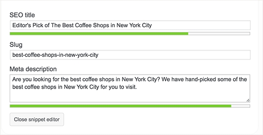 Setelah itu klik tombol 'Tutup editor ringkasan' setelah Anda selesai. Anda akan dapat melihat deskripsi kustom Anda di pratinjau cuplikan sekarang.