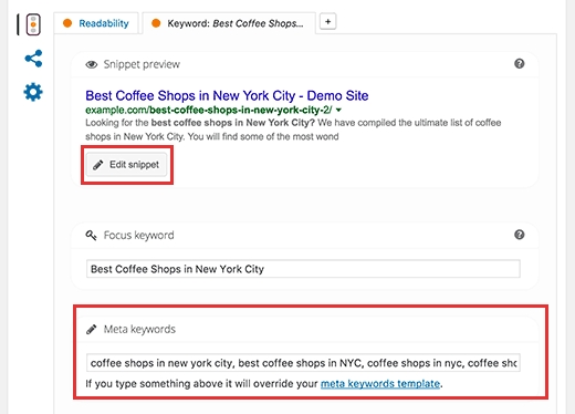 Anda akan melihat judul situs Anda dan secara otomatis membuat deskripsi sebagai cuplikan. Di bawah ini Anda akan melihat bidang Meta Keywords.